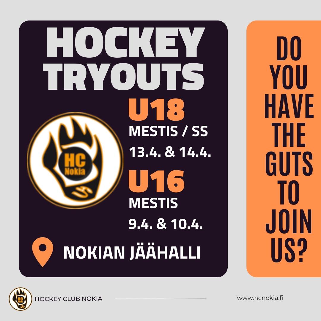 HC Nokia U16 & U18 TRYOUTIT TULOSSA! 🔥 HC Nokia järjestää tulevan kauden joukkueiden tryoutit huhtikuussa – nyt on aika näyttää, mistä sinut on tehty! 🏒 U16 TRYOUTIT 📅 9.–10.4. ⏰ klo 17.00–19.45 ➡️…