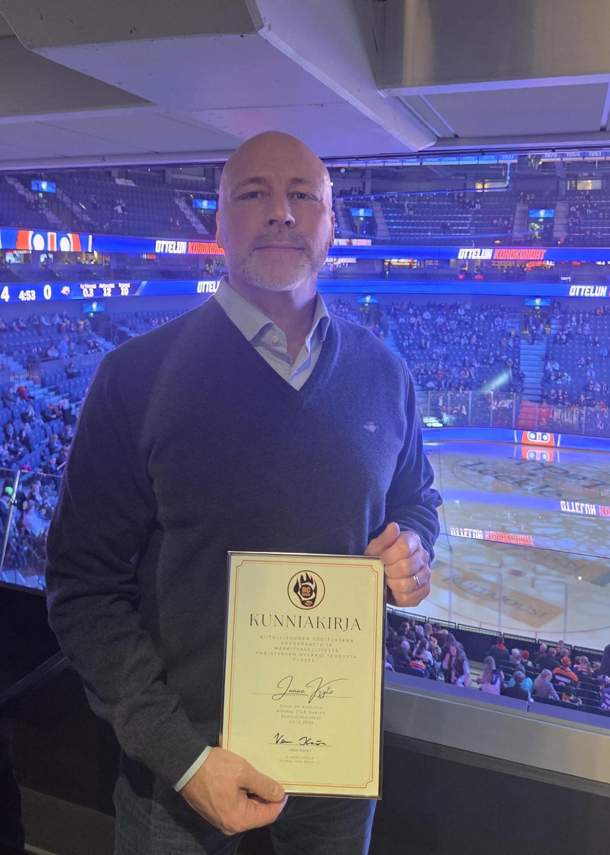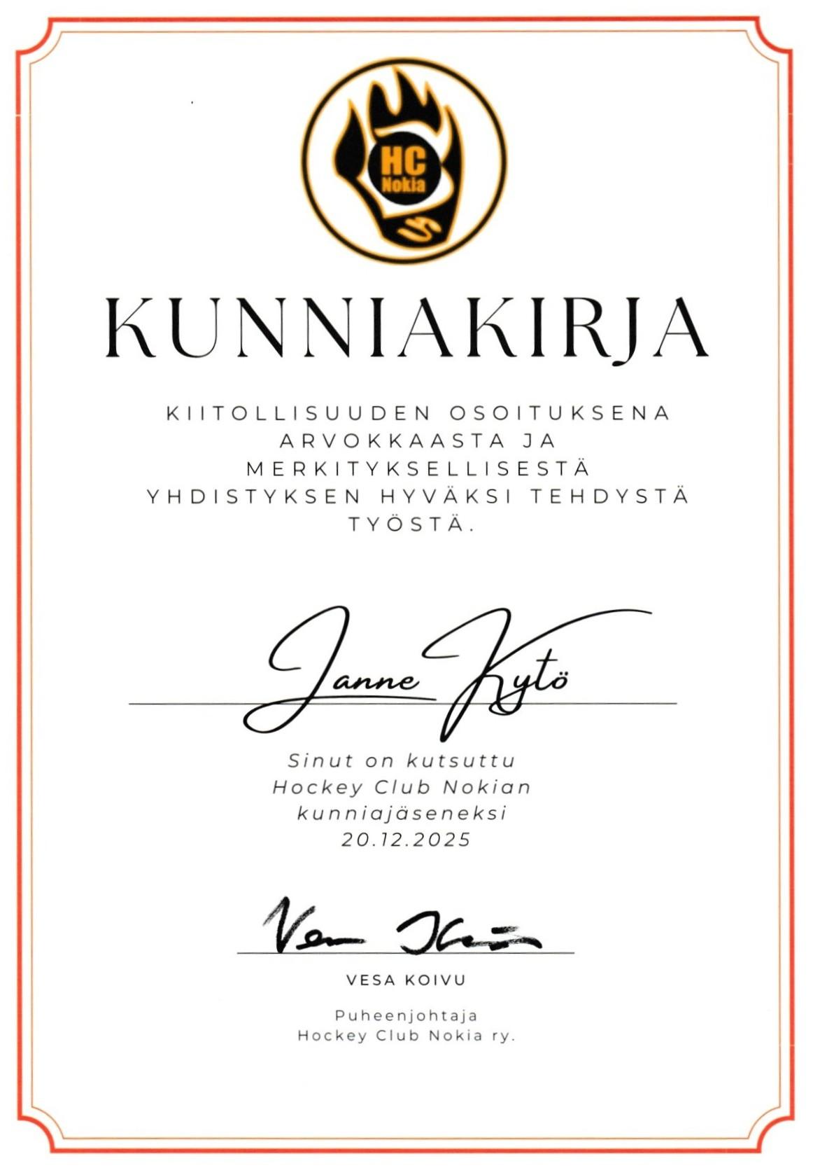Janne Kytö on HC Nokian arvojen ruumiillistuma. Siksi on suuri ilo ja kunnia myöntää hänelle seuran suurin kunnianosoitus kutsumalla hänet seuran kunniajäseneksi.